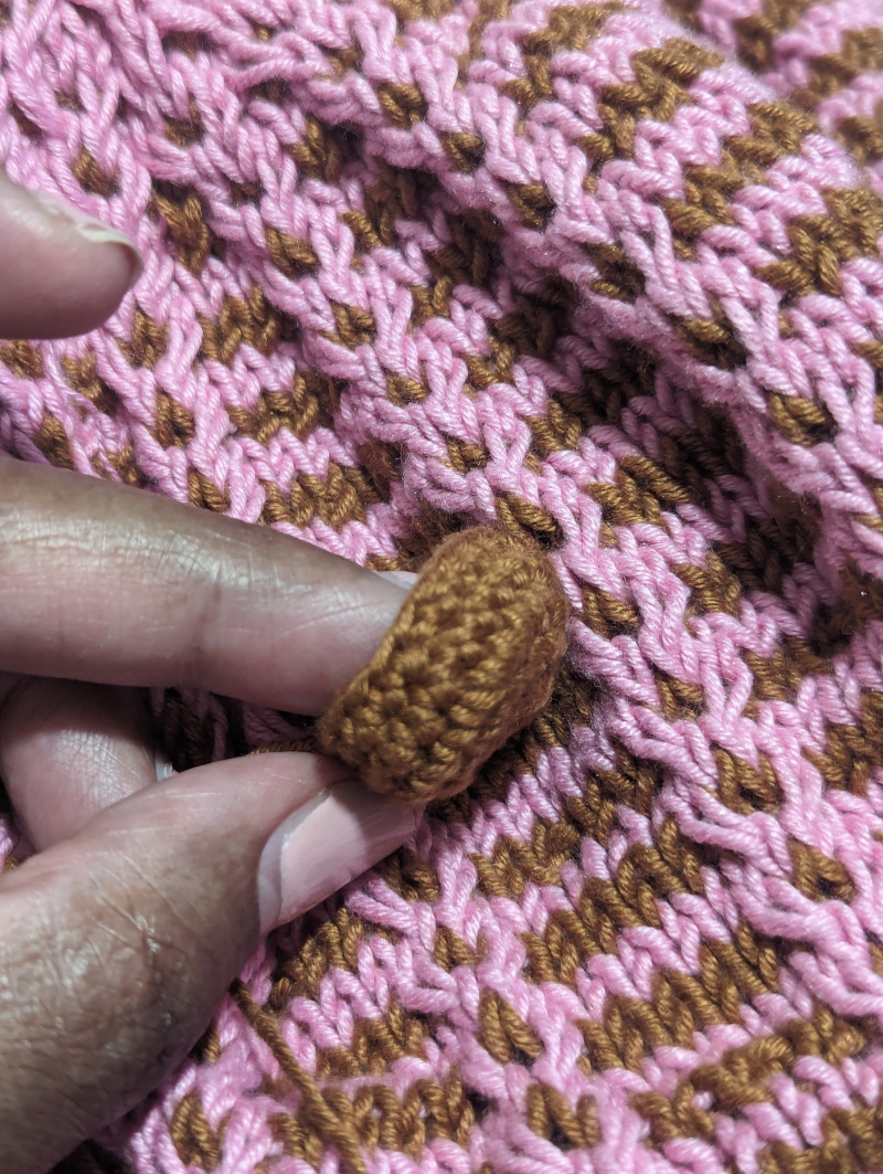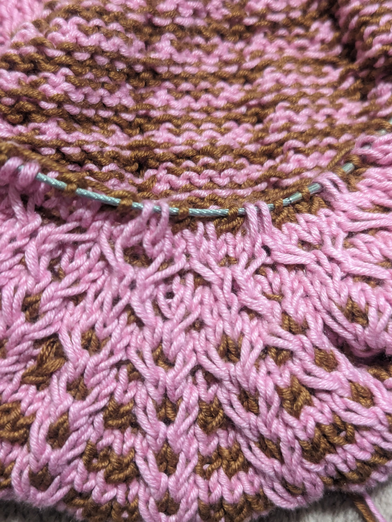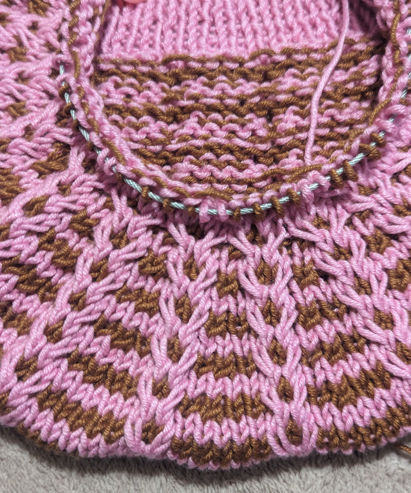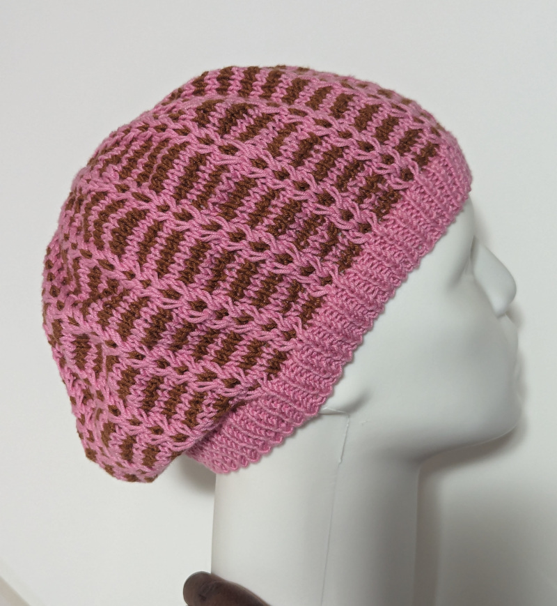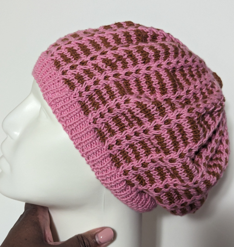 This pink and caramel iteration of the Melody Mosaic Knit Beret is made of 50/50 cotton and acrylic DK blend yarns - Ice Yarns Adel. It has created a drapier fabric than I was expecting, this time around; however, it still retains much of the Melody shape and style that I've grown to love.
