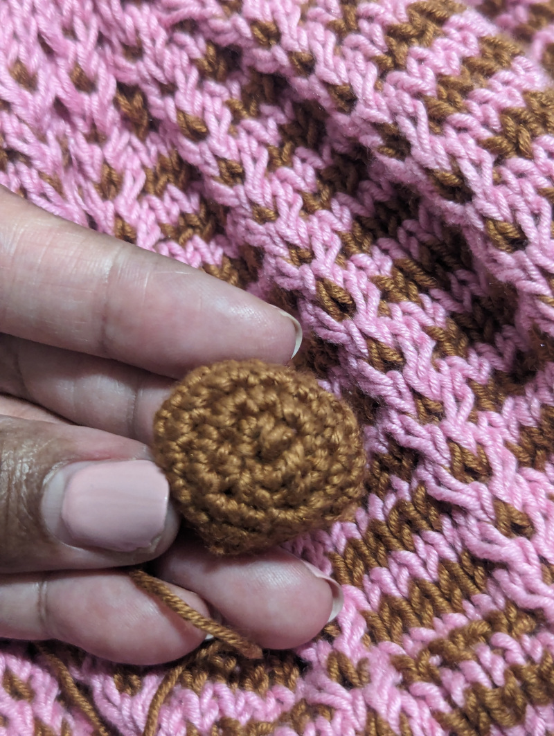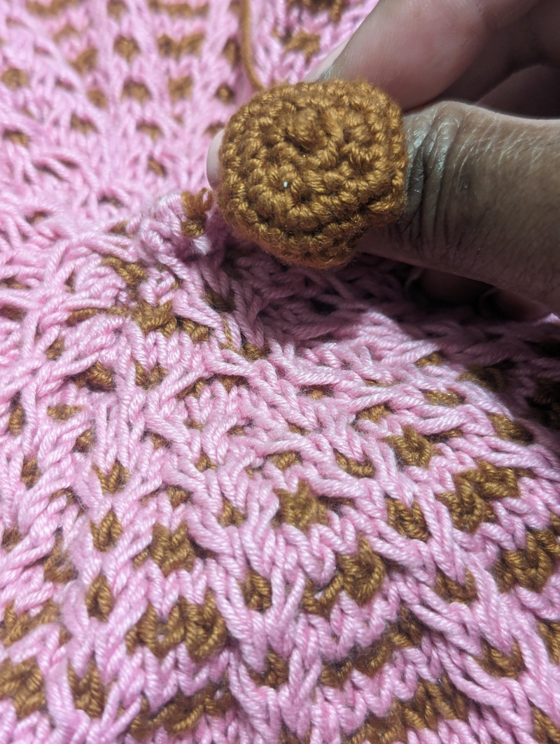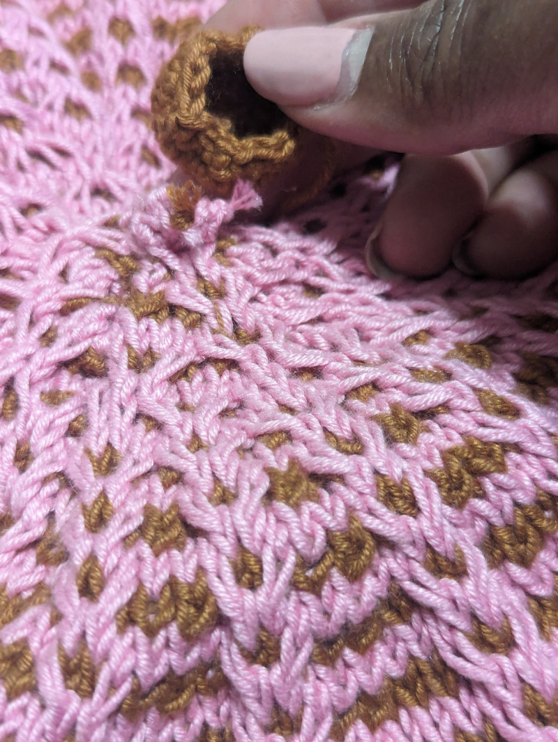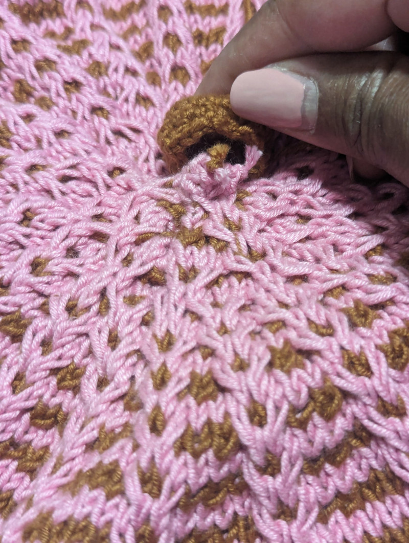 This pink and caramel iteration of the Melody Mosaic Knit Beret is made of 50/50 cotton and acrylic DK blend yarns - Ice Yarns Adel. It has created a drapier fabric than I was expecting, this time around; however, it still retains much of the Melody shape and style that I've grown to love.