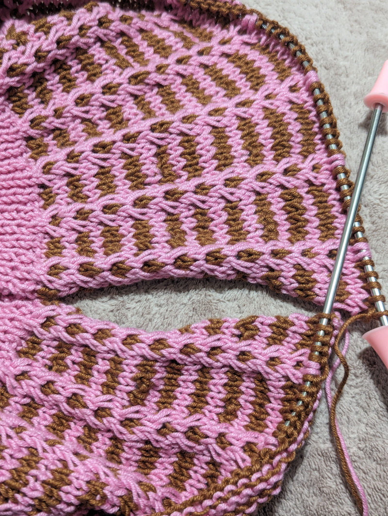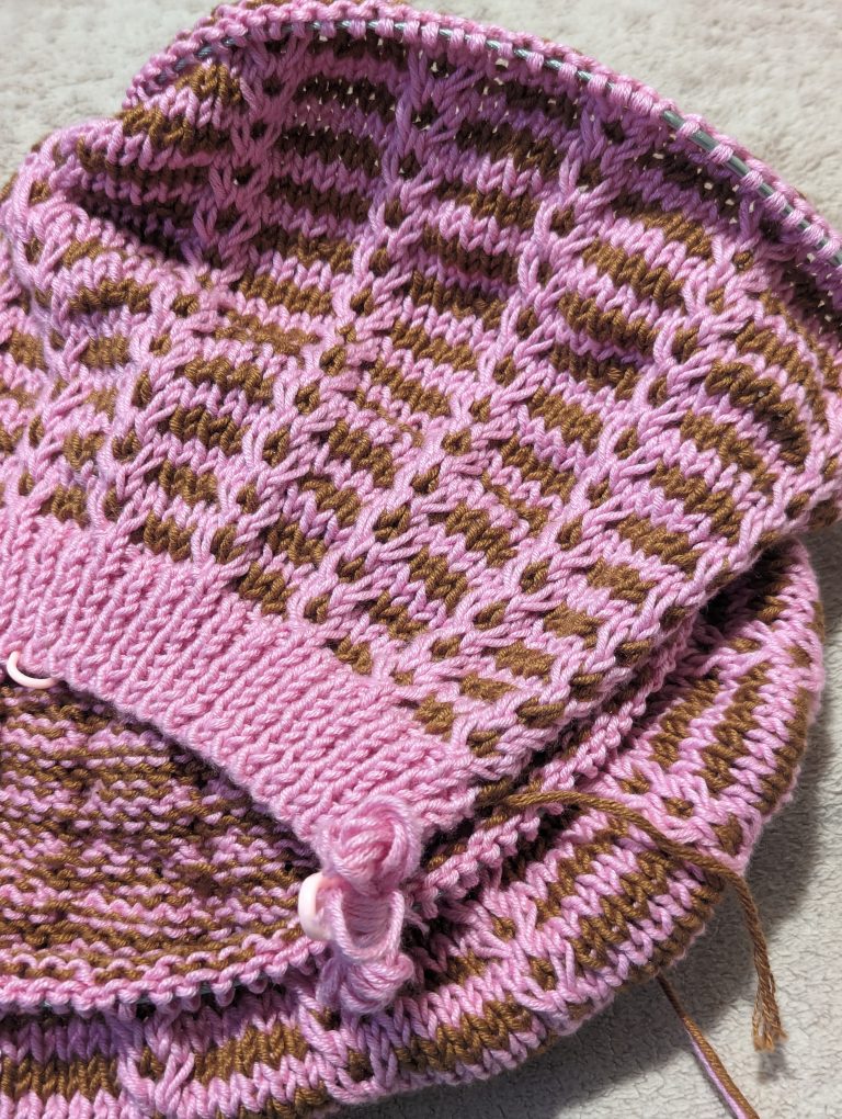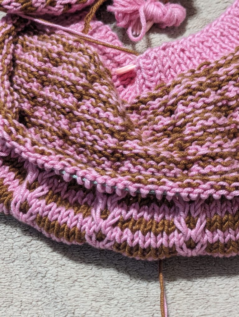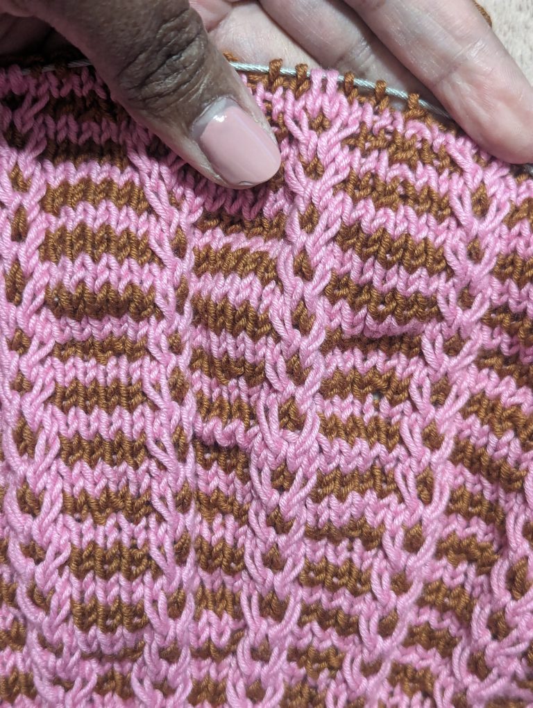 Whenever I finish this pink and brown version of the Melody Mosaic Knit Beret, I will update you on my progress and show off the finished hat.